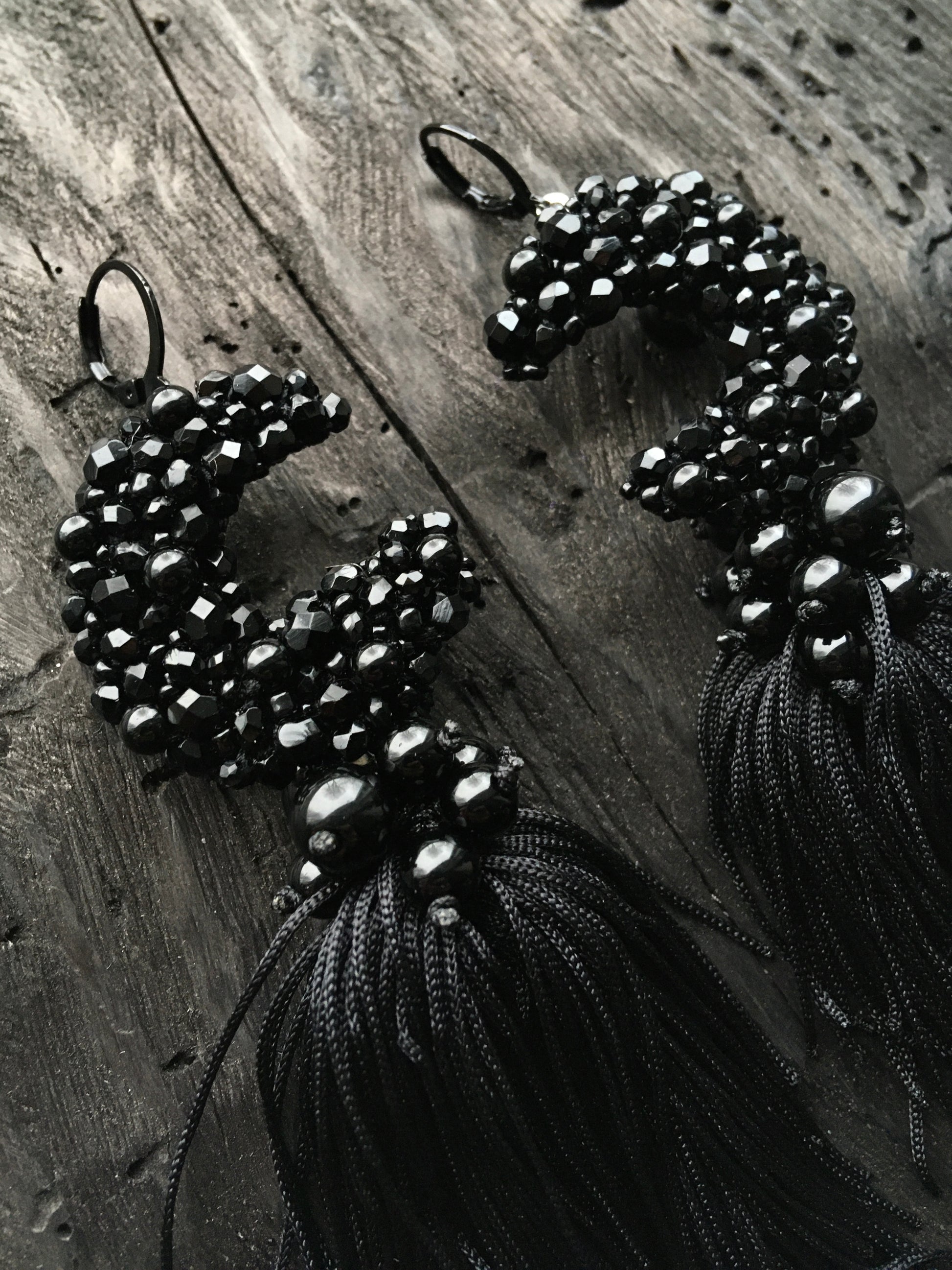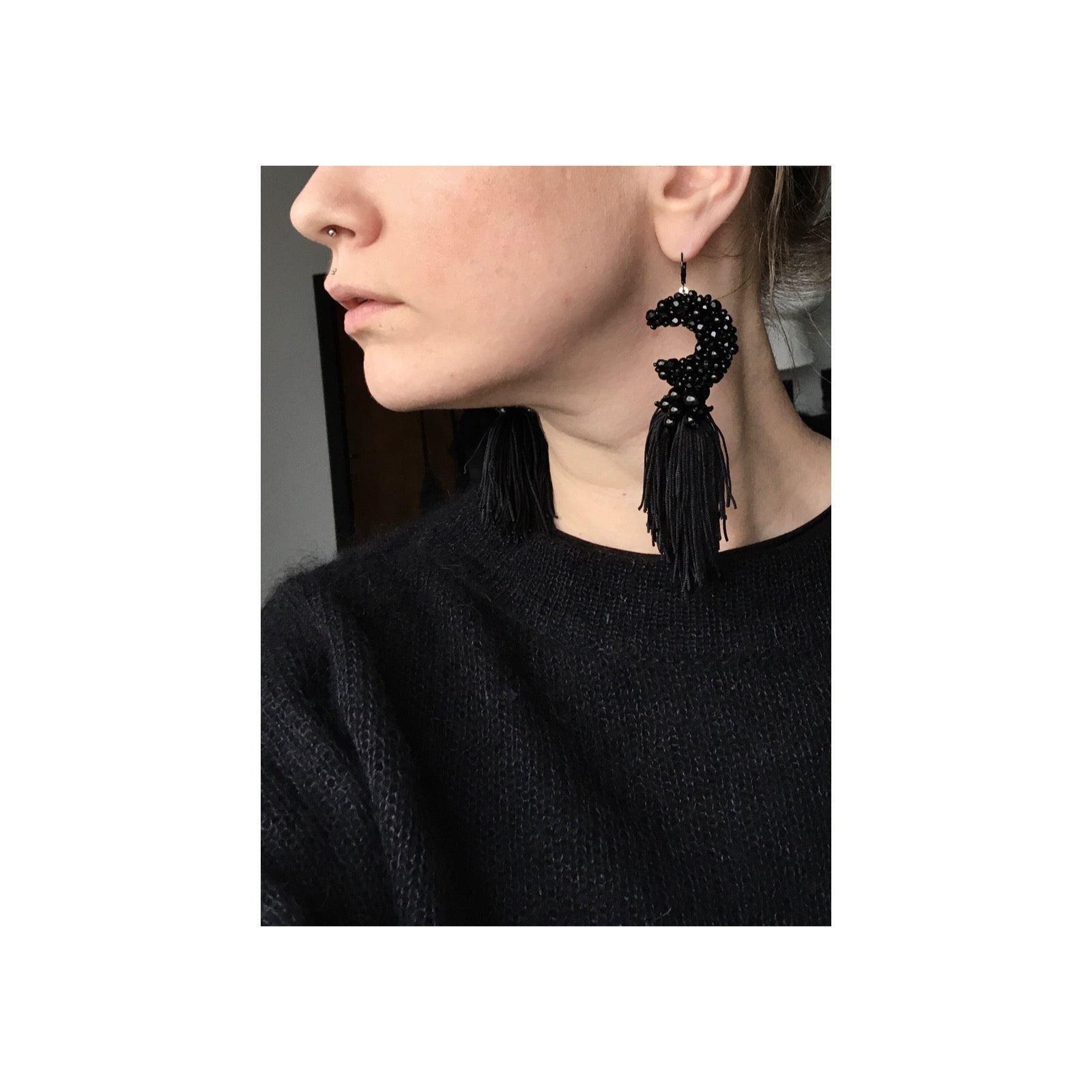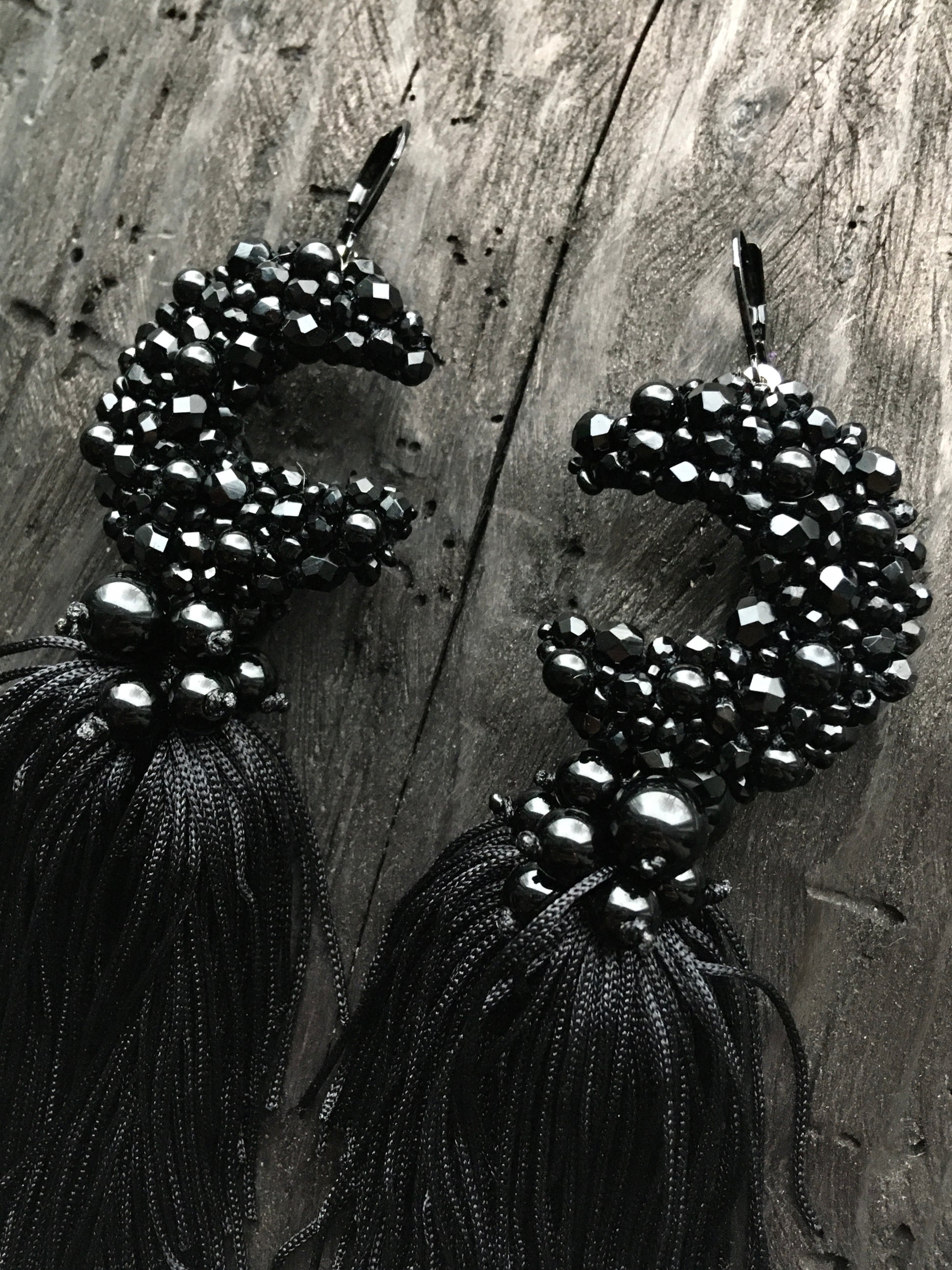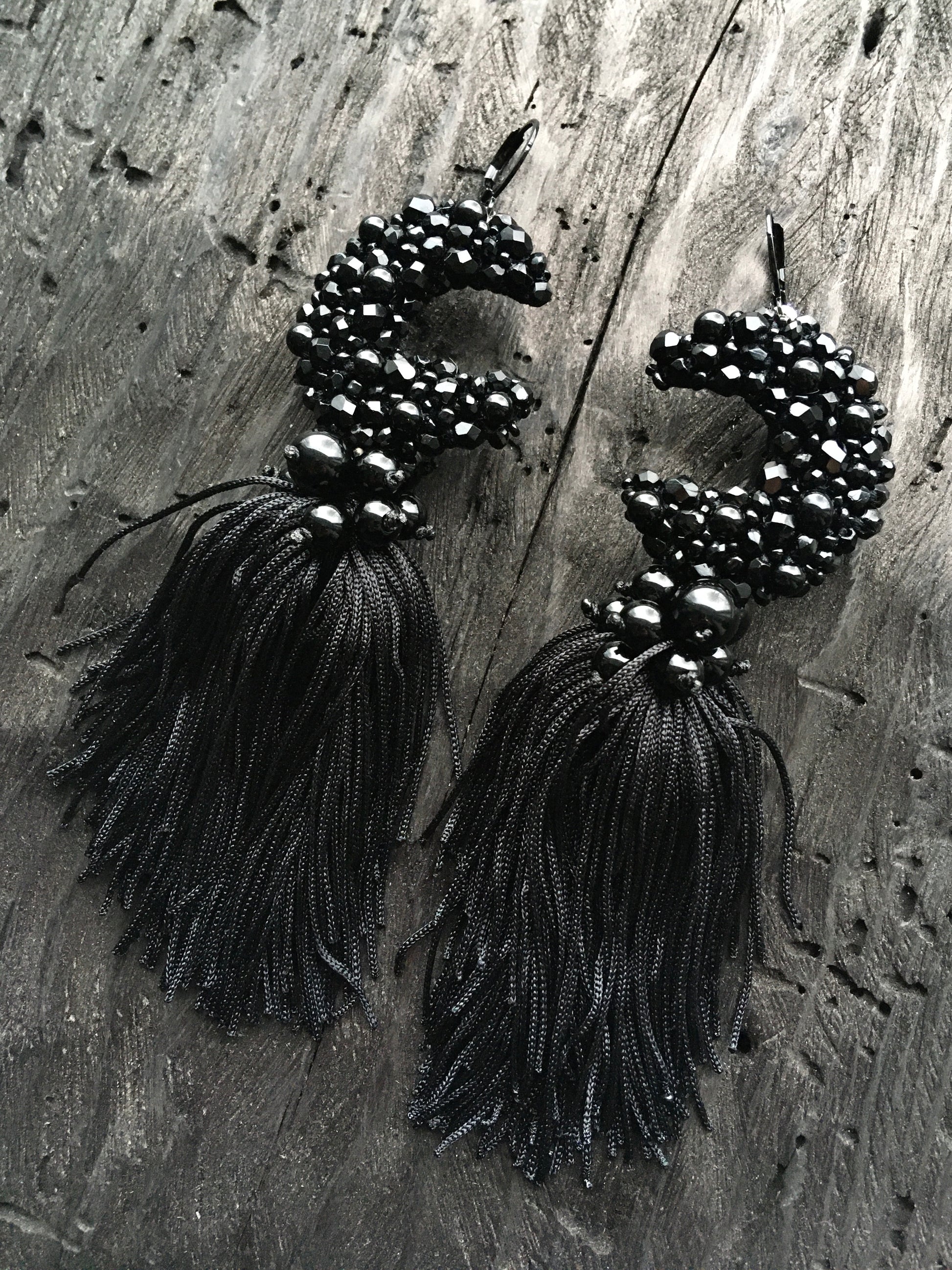 These beaded moon earrings feature high-quality czech glass and toho beads, paired with ONYX gemstones to create unique and elegant moon-shaped earrings. The addition of a tassel adds a touch of playful sophistication. Elevate any outfit with these one-of-a-kind earrings.